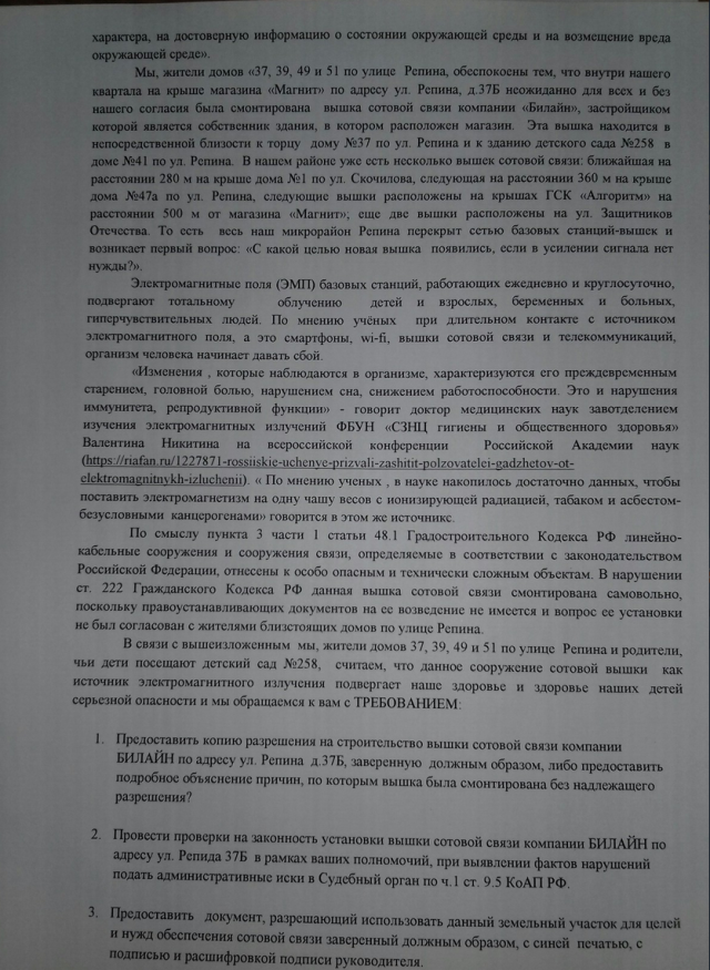 Супермаркет расположен в доме №37-Б на улице Репина. За демонтаж вышки уже начался сбор подписей, об этом сообщается в соцсетях. Там же выложено письмо с обращением к губернатору Сергею Морозову, депутату Гордумы Тамаре Петраш, прокуратуре Ленинского района, а также к управлениям Ростехнадзора и Роспотребнадзора.